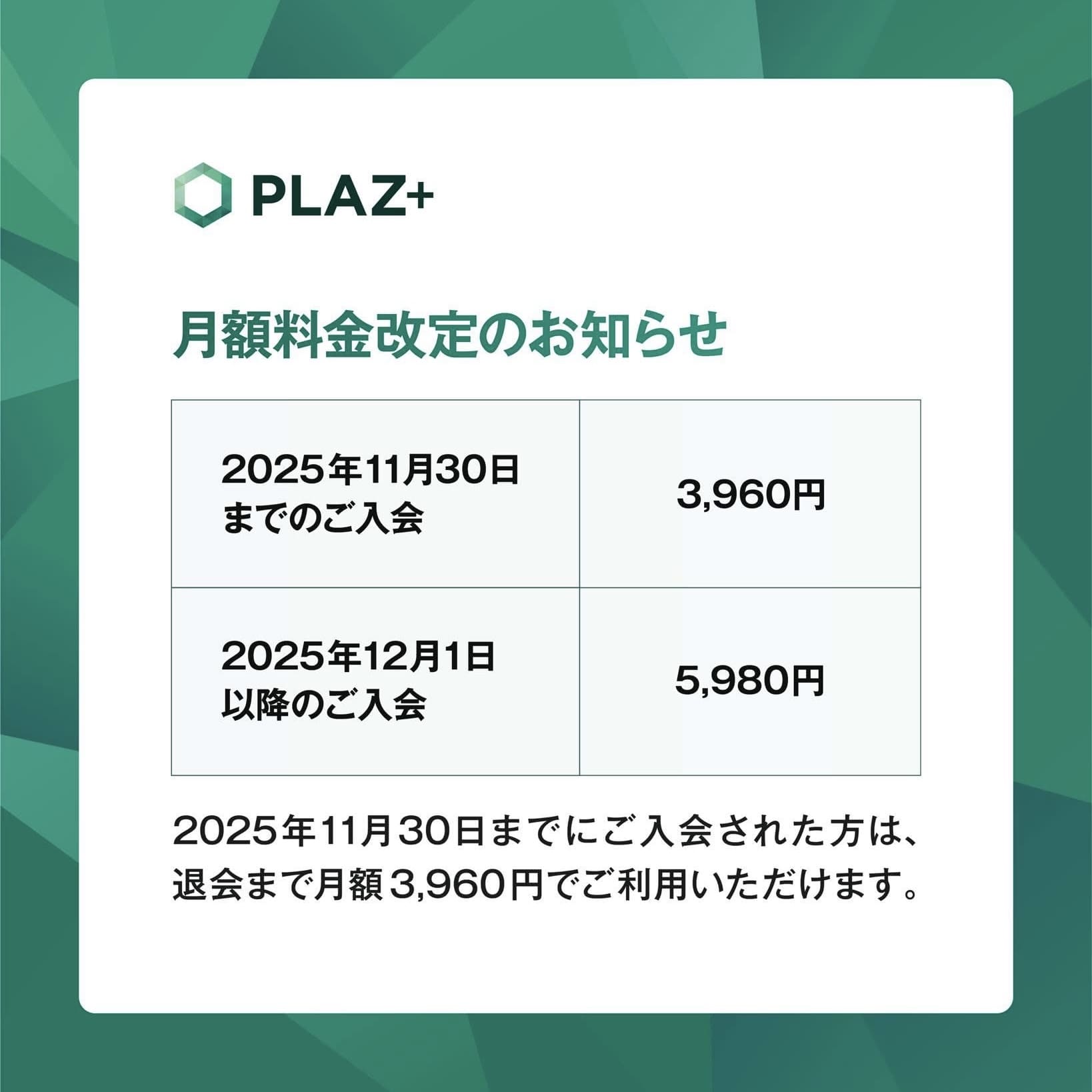 このたび、動画配信に関わるシステム利用料の高騰に伴い、2025年12月1日より、PLAZ+の月会費を3,960円(税込)から5,980円(税込)へ改定させていただくこととなりました。